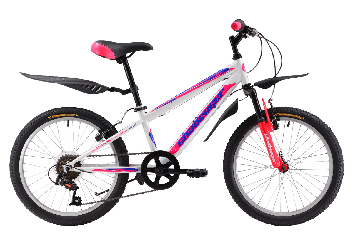 Велосипед Challenger Cosmic Girl 20 предназначен для девочек ростом от 115 до 127см. Challenger Cosmic Girl 20 собран на прочной стальной раме и имеет 6-скоростную трансмиссию. Ободные тормоза типа V-brake надёжно работают и просты в обслуживании. Колёса крепятся в вилке эксцентриком, который позволяет с лёгкостью снять колёса при погрузке в автомобиль. Производитель представил модель в двух стильных цветах - белом и розовом, наиболее подходящих девочкам. Велосипед Challenger Cosmic Girl 20 укомплектован удобными пластиковыми крыльями и подножкой.